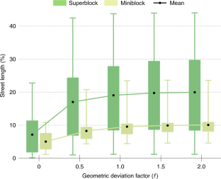 The classified streets, including calculated NDI values and all simulated superblocks and miniblocks for the geometric scenario G1, are available for download as shapefiles or GeoJSON files: https://doi.org/10.5281/zenodo.4562462.