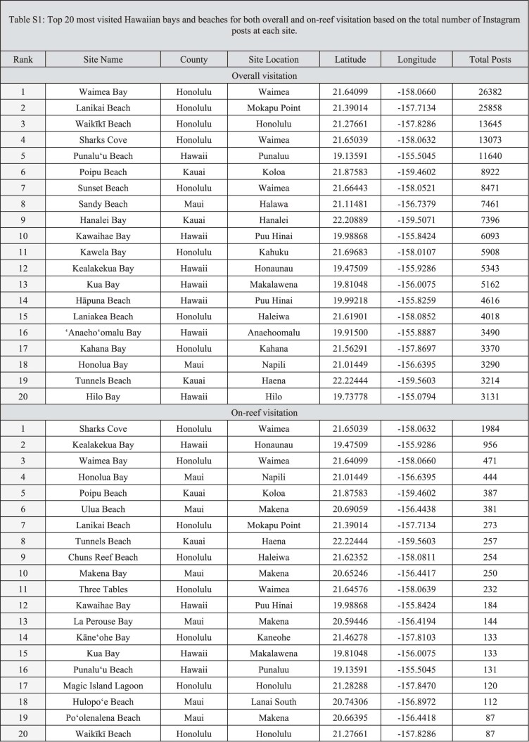 1. Top 20 most-visited Hawaiian bays and beaches for both overall and on-reef visitation based on the total number of Instagram posts at each site.