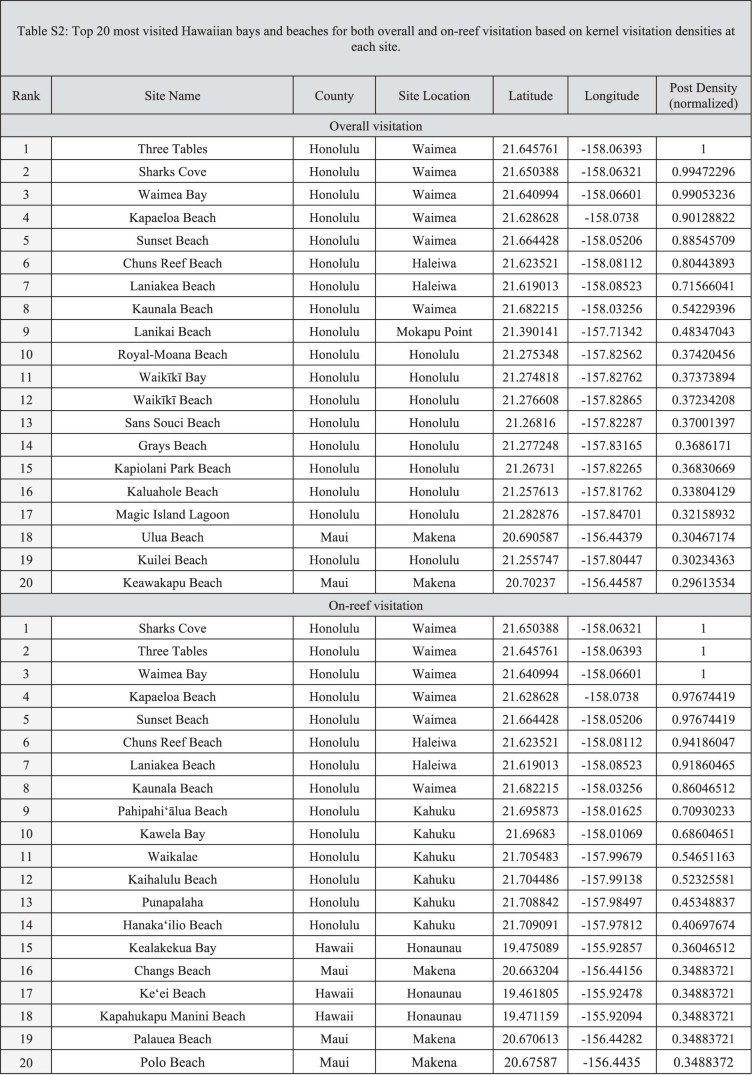 1. Top 20 most-visited Hawaiian bays and beaches for both overall and on-reef visitation based on kernel visitation densities at each site.