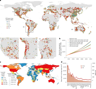 The PV boundary data are available via Zenodo at https://zenodo.org/record/5005868. The mine boundary datasets are available from Maus et al.16 and Tang et al.45, respectively. The European Space Agency WorldCover datasets46 are available via Zenodo at https://doi.org/10.5281/zenodo.7254221 and can also be accessed through GEE. The Terra Moderate Resolution Imaging Spectroradiometer (MODIS) Vegetation Indices (MOD13Q1) are available at https://doi.org/10.5067/MODIS/MOD13Q1 (ref. 51) and can also be accessed through GEE. The terrain data from NASADEM52 are available at https://doi.org/10.5067/MEaSUREs/NASADEM/NASADEM_HGT.001. The river data from Natural Earth are available at https://www.naturalearthdata.com/. The water body data from ESRI WorldCover are available at https://esa-worldcover.org. The road data from the GRIP dataset are available at www.globio.info/download-grip-dataset. The temperature data are available via Global Solar Atlas at https://globalsolaratlas.info/download/world. The power plant data from the Global Power Plant Database are available at http://datasets.wri.org/dataset/globalpowerplantdatabase. The population data from LandScan are available at https://landscan.ornl.gov/. The gross GDP and electricity consumption data are available in Chen et al.53. The carbon emissions data are available at https://db.cger.nies.go.jp/ged/ja/. The global horizontal irradiation data, photovoltaic power potential (PVOUT) data, global irradiation for optimally tilted surface data, diffuse horizontal irradiation data and direct normal irradiation data are available at https://globalsolaratlas.info/download/world.