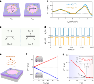 a, Measured change of resistance \({R}_{xx}(\Delta {R}_{xx}={V}_{x}^{\;{\omega }_{1}}/{I}_{x}^{\;{\omega }_{1}})\) as a function of an electric field bias along \({V}_{y}^{{{\;{\rm{DC}}}}}\). b, Temperature dependence of ΔRxx.