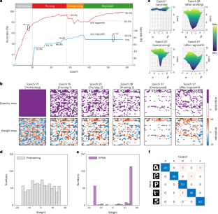 a, Accuracy and Loss curves from experiment (darker red and blue) and simulation (lighter red and blue), respectively. b, Measured and simulated weight maps of critical epochs (10, 16, 22, 28, 37, and 57). c, Inference result with representative inputs of six letters. This figure shows an example of, from left to right, written words ‘s–p–a–r–s–e’, features of conv1 layer, conv2 layer and maxpooling layer, classification output of FC layer, and finally the result of recognized words.