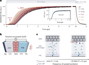 Quantum-dot light-emitting diodes have been achieved with electroluminescent response speeds faster than expected for their organic–inorganic hybrid structure. This breakthrough is enabled by an excitation-memory effect during pulsed operations, whereby the device ‘remembers’ past input signals to emit light faster on subsequent excitation, bypassing delays caused by slow charge transport.