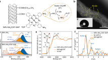 Complexation between Co2+ and Aza-CMP was further examined using X-ray photoelectron spectroscopy (XPS). The high-resolution XPS spectra of Co 2p, C 1s, N 1s and O 1s regions are presented in Fig. 2e–g and Supplementary Fig. 2. The Co 2p spectra of Aza-CMP-Co and Aza-CMP-Co (exfoliated) show doublet peaks centred respectively at ~781.2 (2p3/2) and 796.7 eV (2p1/2) with three satellite features, corresponding to peaks observed in Co2+ complexes containing nitrogen ligands rather than cobalt oxides19,20. The Aza-CMP-Co and Aza-CMP-Co (exfoliated) spectra show signals similar to those of pristine Aza-CMP in the N 1s and C 1s energy regions. The characteristic band for N 1s appears at 399.5 eV, indicating the presence of sp2-hybridized nitrogen components in the holey 2D structure21. Additionally, the binding energy peaks at 283.9 and 284.8 eV in the C 1s spectra can be assigned to sp2- and sp3-hybridized carbon (contributed by surface contaminations), respectively. The two central peaks at 285.5 and 287.7 eV correspond to sp2 C-N bonding and sp3 C-N/other superficial C=O species, respectively22. The O 1s spectra can be deconvoluted into three peaks attributed to -OH, OH2 and C=O groups. The absence of an O 1s signal from metal oxides at ~529 eV implies that no metal oxide phase is generated on the surface of either catalyst23. The powder X-ray diffraction (PDXR) patterns of Aza-CMP-Co and Aza-CMP-Co (exfoliated) are consistent with those of pristine Aza-CMP and Aza-CMP (exfoliated), indicating that the layered and crystalline COF matrix was maintained after Co2+ immobilization (Fig. 2b). The porous structure was evaluated by nitrogen adsorption–desorption isotherms measured at 77 K, which revealed that Aza-CMPs and Aza-CMP-Co are microporous materials (Supplementary Fig. 3). Pore size distribution information was analysed by the non-local density functional theory (NLDFT) method. Aza-CMP and Aza-CMP (exfoliated) powders show a pore size of ~1.36 nm, which matches that of the Aza-CMP structure in the literature (1.37 nm)24,25. Due to relatively low metal loading (1.86 wt%), Aza-CMP-Co shows an almost identical pore size distribution to that of Aza-CMP and Aza-CMP (exfoliated). However, Aza-CMP-Co (exfoliated), with nearly 20 wt% metal loading, demonstrates distinctively smaller pore size (1.25 nm) and sub-nanostructure compared with those of other samples, indicating that complexation between Co2+ and Aza-CMP occurs within the micropores of Aza-CMP. The chemical structure of Aza-CMP-Co was further examined by solid-state 13C cross-polarization/magic angle-spinning nuclear magnetic resonance (13C CP/MAS NMR) spectroscopy. As shown in Supplementary Fig. 4, the loading of paramagnetic Co2+ broadens NMR peaks but chemical shifts from the CMP matrix can still be identified for the Aza-CMP-Co sample. Fourier transform–infrared (FT–IR) and Raman spectroscopy were used to further confirm the functional groups in Aza-CMP-Co and Aza-CMP-Co (exfoliated). The similar Raman spectra obtained for Aza-CMP-Co, Aza-CMP-Co (exfoliated), Aza-CMP and Aza-CMP (exfoliated) prove that no cobalt oxide phases are generated during complexation (Fig. 2c). In the FT–IR spectra, characteristic peaks attributed to C-C, C=C and C=N vibrations remained after Co2+ binding, proving that the chemical structure of the Aza-CMP backbone is preserved well after Co2+ modification (Fig. 2d). A blue shift for ν(C=N) was observed after complexation, when more Co2+ ions were anchored on N sites and ν(C=N) of Aza-CMP-Co (exfoliated) further shifted to 1,251 cm−1, indicating coordination between Co2+ and the phenanthroline-like structure in Aza-CMP26. A similar blue-shift tendency was observed for the -C=C- vibration. In addition, the intensity of the -C-C- vibration diminished as cobalt loading increased, demonstrating the change in the local coordination environment. The valence states and local bonding symmetry of as-fabricated catalysts were probed using the X-ray absorption near-edge structure (XANES) technique. Figure 2h shows the XANES spectra for Aza-CMP-Co and Aza-CMP-Co (exfoliated) with their corresponding reference samples. The XANES profiles of Aza-CMP-Co and Aza-CMP-Co (exfoliated) are virtually identical, suggesting that the same coordination environment was adopted by both catalysts. However, the overall profile of Aza-CMP-Co and Aza-CMP-Co (exfoliated) drastically deviates from those of Co foil, CoO and Co2O3 because of their intrinsically different coordination environments. The normalized Co K-edge absorption thresholds of as-fabricated catalysts are similar to those of CoO, indicating that the valence state of cobalt is approximately +2. Moreover, the weak intensity of the pre-edge peak at 7,710.4 eV indicates a broken square-planar configuration and the presence of axial ligands27. The coordination configurations for the as-fabricated catalysts were further investigated by extended X-ray absorption fine structure (EXAFS) analysis. As shown in Fig. 2i and Supplementary Fig. 5, the FT EXAFS spectra of Aza-CMP-Co and Aza-CMP-Co (exfoliated) feature almost identical dominant peaks in the first-shell region, indicating the same coordination configuration. Specifically, the dominant peaks located at ~1.65 Å are ascribed to the Co-N/O scattering path. The absence of peaks in the second-shell region suggests the absence of a Co-based metal or an oxide phase, which further corroborates the formation of single-site cobalt ions in Aza-CMP-Co catalysts. EXAFS wavelet transform (WT) analysis in Fig. 2k provides additional k-space resolution to discriminate backscattering atoms despite their considerable overlap in the R space28. WT analysis of Aza-CMP-Co and Aza-CMP-Co (exfoliated) detected only one intensity maximum (assigned to the Co-N/O contributions) at 3.90 and 3.91 Å−1, respectively, which can be clearly distinguished from the Co-Co (Co foil, k = 7.3 Å−1), Co-O (Co2O3, k = 4.7 Å−1) and Co-O paths (C