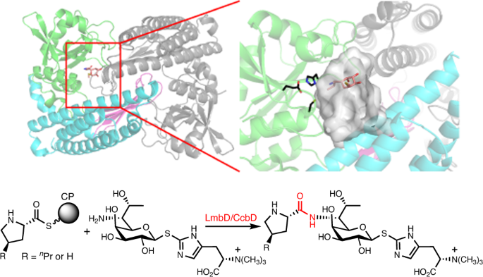 In conclusion, our structural analysis of CcbD revealed that CcbD/LmbD catalyses the formation of the pharmacophore of lincosamide antibiotics via a mechanism that is structurally and mechanistically significantly distinct from the previously identified CP-dependent amide bond-forming enzymes, and thus provided insights into the diversity of amide bond-forming reactions in nature. Future structure-based engineering of CcbD/LmbD will develop the enzymes as biocatalysts to generate unnatural lincosamides with various acyl and sugar moieties for future drug discovery.