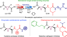 Amide bond formation is one of the most ubiquitous reactions in nature, and a variety of amide bond-forming enzyme families have been identified, including the condensation (C)-domain of NRPS, ATP-dependent amide bond synthetase, N-acyltransferase, aminoacyl-tRNA synthetase, PCS and ATP-grasp enzymes35. Among them, the CP-dependent amide bond formation is known only in the C-domains of NRPSs and some Gcn5-related N-acetyltransferase (GNAT) enzymes35,36,37,38. The structure of the NRPS C-domain consists of two domains that form V-shaped pseudo-dimers (Supplementary Fig. 1c)19,39,40,41. The active site, formed in the interface tunnel of the two domains, contains the conserved HHxxxDG catalytic motif for positioning the α-amino group of the acceptor substrate to facilitate the nucleophilic attack to the thioester in the donor substrate. Donor and acceptor peptide CPs bind on the front and back faces of the active site tunnel. Although the structures of CP-dependent GNAT enzymes have not been reported, GNAT superfamily enzymes share the conserved GNAT-fold comprising the central β-strands flanked by α-helices (Supplementary Fig. 1h)42.