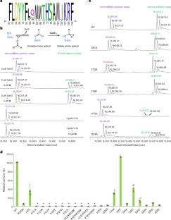 SdnG or its mutational variants (5 µM) were mixed with varied amounts of 4 and the mixture was immediately treated with 20 mM NaBH4. The reaction was subsequently analyzed by UHPLC-HRMS and the deconvoluted ESI-MS spectra were shown in the figure. Increased concentration of 4 promotes imine formation of SdnG but not the H72A variant. The result suggests that ligand binding is rate-determining for iminium formation in SdnG but not in the H72A variant. Therefore, diminished iminium formation in H72A is not a result of compromised ligand binding.