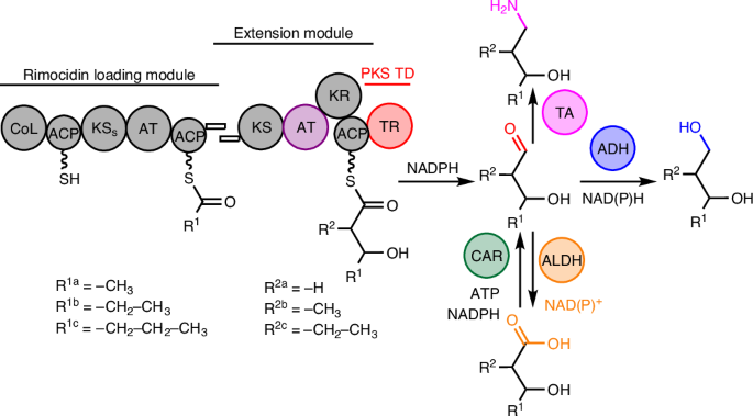 An appealing strategy to overcome this challenge is to use terminal thioester reductases (TRs)11. Reduction-dependent termination in natural product biosynthesis is common in non-ribosomal peptide synthetases (NRPSs), carboxylic acid reductases (CARs), hybrid PKS and NRPS, and fungal iterative PKS systems17,18,19,20,21,22. These reductase (R) domains catalyse nicotinamide adenine dinucleotide (NADH)-dependent or nicotinamide adenine dinucleotide phosphate (NADPH)-dependent two-electron reduction to produce aldehydes or aldehyde derivatives, or four-electron reduction in two steps to produce alcohols. For comparison, modular PKS chain release catalysed by TRs has been reported in the past decade, but with only a handful of examples23,24,25,26,27,28,29, including the coelimycin and cyclizidine PKSs. These are often coupled with cognate transaminases (TAs) in biosynthetic gene clusters (BGCs): TR catalyses two-electron reductive cleavage of the acyl substrate to produce an aldehyde, which is subsequently converted to an amine by the TA23. Apart from a few studies to understand natural PKS TRs, they have not been used in engineered PKSs.
