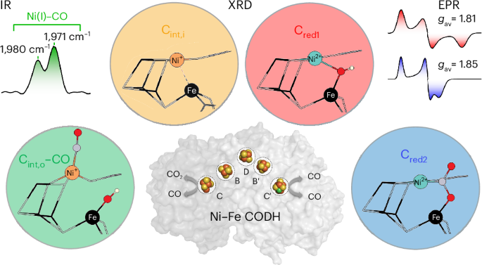 Catalysts that selectively bind and efficiently reduce CO2 are required for a sustainable economic future, but their development is challenged by high activation energies, product inhibition and lack of substrate selectivity1,2. Carbon monoxide dehydrogenases (CODHs) are ancient enzymes found in anaerobic bacteria and archaea that catalyse the reversible reduction of CO2 with two protons and two electrons to CO and water2,3,4,5. CODHs are among the few enzymes in nature that contain nickel, here integrated within a [NiFe4(OH)(µ3-S)4] cluster, known as the C cluster, which can be described as a distorted NiFe3S4 cubane connected to an Fe(II) in an exo position6,7,8. The C cluster transfers electrons to and from a [4Fe4S] cluster, known as the B cluster6,7. According to the current model of the catalytic cycle, the C cluster alternates between three different electronic states, referred to as Cred1, Cint and Cred2, which have been distinguished by means of their spectroscopic properties9,10,11,12. In its most reduced paramagnetic state (Cred2), the C cluster reduces CO2, while in the two-electron more oxidized paramagnetic Cred1 state, it binds and activates CO (refs. 9,10). The diamagnetic Cint state is one-electron more reduced than Cred1 and one-electron more oxidized than Cred2 (ref. 11).