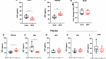 Oxytocin immunoreactivity levels in serum and CSF were quantified by using an oxytocin EIA kit (Enzo Life Sciences, NY, USA, formerly Assays Designs, MI, USA), following the manufacturer’s manual. The CSF samples (5 μl) were thawed and diluted 1:20 in assay buffer77. CSF samples were assayed without protein extraction due to the low protein concentration in the CSF. The plasma samples (100 μl) were thawed on ice and assayed with protein extraction5,77, whereas an additional extraction step may have resulted in lower than actual oxytocin levels. Each sample volume was so small, the CSF was assayed without extraction, though unextracted samples result in binding of complexes of oxytocin stuck to interacting proteins. The oxytocin assay had two linear ranges, which covers a lower concentration range from a few to 30 pg/ml, and a higher concentration range between 50 and 1000 pg/ml. The inter-assay and intra-assay coefficients of variation were less than 15%.