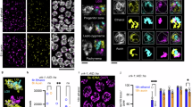 Immunostaining experiments were performed as described elsewhere44. Briefly, cells were treated for 6 h with 25 μM colchicine (Sigma), immobilized onto a slide by centrifugation for 10 min at 500 rpm with low acceleration in a TermoShandon Cytospin using a single-chamber Cytofunnel and, then, fixed in 4% paraformaldehyde for 10 min, washed with PBS and blocked in 3% BSA, 0.5% TritonX-100 in PBS. Samples were then immunostained with αBAF (1:300), αBAFpS5 (1:200), rat αCENP-C (1:500), rabbit αCENP-C (1:300), αCENP-ACID (1:500), αHP1a (1:200), αHP1c (1:500), αFlfl (1:1000), αFLAG (1:2000), αTubulin (1:10,000), αTAP (1:300), and αLaminB (1:1500) antibodies. For visualization, slides were mounted in Mowiol (Calbiochem-Novabiochem) containing 0.2 ng/ml DAPI (Sigma) and analyzed in a Leica TCS/SPE confocal microscope equipped with LAS/AF software. Images were acquired and processed identically using ImageJ (http://imagej.nih.gov/ij/) and Adobe Photoshop software. Mean grey intensities were calculated using ImageJ macros47 on thresholded images at DAPI-masked regions of interest running analyzed particles to plugin on the FeatureJ Laplacian (http://imagescience.org/meijering/software/featurej/).