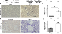Statistical data analyses were performed using GraphPad Prism software (8.2.1). Normal distribution of each sample group was confirmed using χ2-test or Shapiro–Wilk test before comparison between groups. All data were expressed as mean ± SEM and statistical analyses were performed using Student’s t-tests (two-sided) to compare two groups or analysis of variance followed by post hoc Tukey’s test, to compare multiple groups. For all experiments, the number of replicates is shown in the figure legends. For experiments with mice, the number included is also noted in the figure legends. A minimum sample size of five mice in each group was used based on both our previous experience and power analyses. We have at least 80% power to detect an effect size of two between WT and KO groups, or diabetic and nondiabetic groups at a confidence level p < 0.05 using two-sided t-tests. Asterisks indicate significant difference (*p < 0.05, **p < 0.01, ***p < 0.001, and ****p < 0.0001).