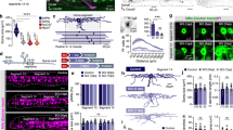 We first examined the possibility that the Mauthner (M-) axon might regenerate better when the spinal cord is injured closer to the soma of the M-cell. We therefore compared regeneration of the M-axon in zebrafish larvae after systemic spinal cord injury had occurred either distally, as in a previous work24, or much closer to the soma (proximal injury; 500–550 μm from the soma; Fig. 1a, b). Following distal injury (1599 ± 31 μm; N = 28), the severed caudal part of the M-axon always (14 of 14 cases) degenerated within 24 h through Wallerian degeneration19,41. The rostral part of the M-axon that was still in contact with its soma often withdrew a few micrometers from the injury site but always survived. However, only 46% (13 out of 28) of the M-axons showed a regenerative response, thus confirming previous findings24. Moreover, regeneration, when it occurred, was poor (Fig. 1a, e; Fig. 2a; Axon lengths: 2 dpi: 1637 ± 52 μm; 3 dpi: 1731 ± 40 μm; 4 dpi: 1858 ± 47 μm; 7 dpi: 1915 ± 60 μm). In many cases (13 of 28) the axon was unable to penetrate the injury site and axons showed a phase in which they grew aberrantly and even in reversed (anterior) direction (Fig. 1c). Such aberrations indicate that axonal regrowth per se might still be possible but that targeted regeneration is inhibited, making the recovery of function impossible.