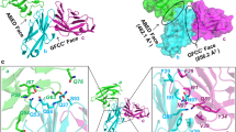 Interestingly for both of the V39A-containing dimers, a considerable metal ion electron density (4.0 σ intensity in the 2Fo–Fc electron density map) was observed at V39A molecule (a) and (c); the density was modeled as nickel (Ni++) that was hexa-coordinated by residues H105 and V106 from three neighboring IgV molecules found in the unit cell and crystallographic symmetry mates (Supplementary Fig. 6). Similar Ni++ binding was observed in a previously published hCEACAM1 WT structure (PDB code 2GK2) where minor interactions between two hCEACAM1 molecules through the ABED face were observed. To our surprise, we observed a similar ABED face-mediated interaction with conserved hydrogen bond interactions between molecules (b) and (c) in the V39A crystal compared to the WT structure (PDB code 2GK2) with comparable similarity (RMSD of 2.7 Å over 1647 atoms) (Supplementary Fig. 7, Supplementary Tables 9, 12). Taken together, the V39A crystal structure demonstrated a notably diminished set of intermolecular interactions at the GFCC′ face but not at the ABED face and provides a structural basis for the monomer-inducing feature of the V39A substitution suggested previously17,29.