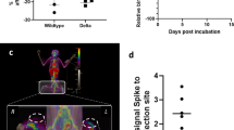 For each experiment, image sequences were imported into ImageJ. The ROIs, identified from pilot experiments, were neck (including the salivary glands, trachea, pharynx), thorax (lungs and heart), upper abdomen (including the liver, spleen), lower abdomen (the intestine and kidneys but not bladder), and paw (a type of skin region with no clear relationship with COVID-19) (Fig. 1a). Mean pixel intensity within each ROI was measured for each time point using the images without enhancement. The background signal was the same ROI without the injection and this was subtracted from the intensity at each time point. To correct for experimental variation, the intensity at each time point was divided by peak intensity to standardize the data. Peak intensity (Imax) was identified as the average of 10 s at the peak identified using GraphPad Prism software (Version 9.1.0 (216)). The AUC was determined by running AUC analysis option in GraphPad Prism. The elimination rate constant was determined from the slope of the falling phase of the intensity profile using a semi-natural logarithmic (Ln) plot and the linear regression function in the GraphPad Prism. For the liver, since there was a linear component of the intensity-time profile after the distribution phase, the slopes were determined from the plots using the linear regression option in GraphPad Prism.