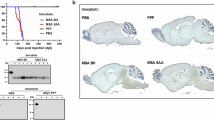 Human and mouse α-syn PFFs: Human and mouse α-syn seeds were prepared as described previously14. In brief, the Escherichia coli strain BL21(DE3) was transformed with the expression vector pET15b encoding human or mouse α-syn. The expression of His-tagged α-syn was induced by the addition of 0.5 mM isopropyl β-d-thiogalactoside at 37 °C for 3 h. Cells were lysed by ultrasonication in PBS containing 2% Triton X-100, centrifuged at 20,000 × g for 30 min, and the supernatant was then loaded on a Ni Sepharose 6 Fast Flow column (1 mL, GE Healthcare). α-syn was eluted with a buffer containing 50 mM Tris–HCl, 100 mM NaCl, and 250 mM imidazole at pH 8.0. The eluted samples were concentrated by centrifugation at 3000 × g for 15 min using Vivaspin Turbo (5 K MW) tubes (15 mL) with buffer containing 50 mM Tris–HCl and 100 mM NaCl, pH 8.0. Proteins were treated with thrombin (GE Healthcare) to remove the N-terminal His-tag. Purified α-syn monomers in 50 mM Tris–HCl containing 100 mM NaCl (pH 8.0) (100 μM, 150 μL) were incubated at 37 °C at 1200 rpm in a shaking incubator (DWMax M/BR-034,Taitec) for 7 days. Measurements at OD 600 (or other wavelengths) were used to check turbidity. α-syn PFFs were pelleted by spinning at 50,000 × g for 20 min and suspended in PBS.