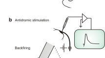 After establishing stable MN recording, we started the presentation of our set of stimuli. A set of stimuli, as designed for the present study, contained repeated antidromic activation of the MN and repeated acoustic and visual stimulation of the fish. Each of the stereotyped stimuli was consecutively presented to the fish at least 40 times per set. We always presented the stimuli in the same order: first: antidromic stimulation; second: acoustic stimulation; third: visual stimulation (Supplementary Fig. 1b). Intervals between the stimuli were chosen in each case to avoid after effects and habituation. In total, presentation of a set of stimuli took about 10 min. Electrical pulses (10 µs in duration; inter-stimulus interval: 500 ms) used for antidromic MN activation were delivered by a constant-voltage isolated stimulator (DS2A2 – Mk.II; Digitimer Ltd., UK). Desired pulse amplitude was set just so to only elicit action potentials in the large MN axons, but not in any other axons that are thinner and would therefore require higher stimulation pulse amplitude. It was determined by first reducing pulse amplitude until antidromic stimulation did not activate the MN anymore. Then the pulse amplitude was increased slightly above threshold. For acoustic stimulation, we used an acoustical broadband pulse (duration: 1 ms; frequency distribution from 25 to 1000 Hz; peak amplitude at 300 Hz; sound pressure level (SPL): 145 dB re 1 μPa; inter-stimulus interval: 4 s) delivered by a multifunctional active loudspeaker (The box pro Achat 115 MA; Thomann GmbH, Germany). We measured SPL under water at the position of the fish in the recording chamber with a hydrophone (Type 8106; Brüel & Kjær, Denmark). For visual stimulation, we used a light-emitting diode (LED; RS Components GmbH, Germany), which was positioned directly in front of the ipsilateral eye (e.g., left MN, left eye). The emitted light flash had a duration of 7 ms. Inter-stimulus interval was 10 s. LED peak radiation at 569 nm was 700 μW m−2 nm−1 and the width at 100 μW m−2 nm−1 was 56 nm (range: 543–599 nm).