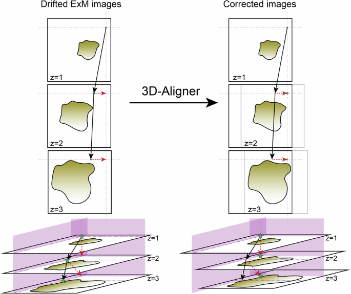 ExM is increasingly gaining popularity in cell biology research, with protocols continuously evolving in diverse directions to meet the varied needs of researchers. ExM enhances resolution by physically expanding specimens in 3D, necessitating a large field of view (FOV) with an extensive z-range for imaging. This physical expansion significantly reduces fluorescence signals, leading to extended image acquisition times. These prolonged imaging durations and large z-ranges further increase the risk of distortions from physical drift, making accurate post-image processing for drift correction important. In this study, we introduce 3D-Aligner, an innovative and user-friendly image correction tool that computationally addresses sample drift in ExM, ensuring accurate 3D image reconstruction and downstream quantification. We underscore the importance of correcting for sample drift by demonstrating substantial errors in the visualization and measurement of centromere and nucleus size and volume between pre- and post-corrected images (Fig. 4).
