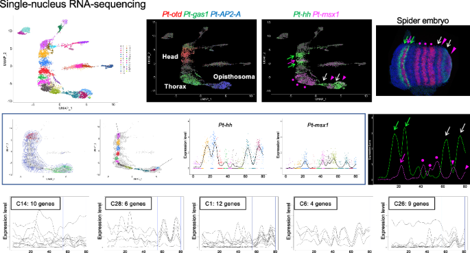 We established a novel method to generate quantitative gene expression profiles along the reconstructed AP axis in a UMAP plot (Fig. 5; Supplementary Fig. 9). These profiles accurately reflected the gene expression patterns along the AP axis in the Parasteatoda embryo, including distinct phases of the segmental stripes. This approach enabled genome-wide, unbiased identification of genes exhibiting specific AP expression patterns. We identified 213 genes from stage-7_nucleus data and 264 genes from late stage-5_nucleus data that could be used to reconstruct the AP pattern, including the segmental stripe pattern at stage 7 (Fig. 6; Supplementary Fig. 11). Although this does not definitively prove that these genes directly establish the AP pattern during embryogenesis, it provides crucial clues for identifying the underlying molecular networks. By analyzing the first derivatives of the expression profiles, we identified gene groups with similar peak patterns (Supplementary Figs. 14–16), which are candidate genes involved in stripe formation. Furthermore, we examined gene expression in the posterior region at single-cell resolution to identify gene pairs that tend to be co-expressed or expressed in a mutually exclusive manner (Fig. 8E, F, Supplementary Fig. 17). This analysis provides valuable data for investigating potential gene interactions. These analytical approaches can be applied to embryos at different developmental stages. As the Parasteatoda spider lays hundreds of eggs simultaneously, we can analyze serial pools of embryos collected according to time-based staging. Embryos subjected to gene knockdown experiments can be analyzed similarly. These advantages of using spider embryos facilitate a further investigation of the dynamic cell-state regulation of the stripe-forming processes. The high-resolution, quantitative single-nucleus data generated in this study provide a robust foundation for a deeper understanding of the diverse mechanisms underlying the arthropod segmented body axis and offer a reliable connection to the mathematical modeling of cell-based patterning processes.