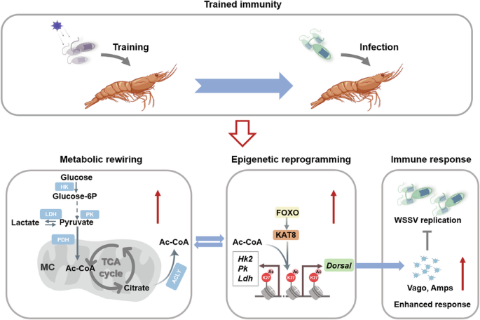 The vertebrate immune system involves both innate and adaptive immune responses. Invertebrates typically possess only innate immunity against invasive pathogens and lack immunological memory. However, research over the past two decades has demonstrated that innate immunity can exhibit memory, a phenomenon called innate immune memory, or trained innate immunity1. Trained immunity is characterized by faster and more effective immune responses upon restimulation and provides long-term protection against foreign invaders2,3. The mechanisms of trained immunity are well known in the innate immune cells of mammals. Trained immunity is driven by the integration of signaling, metabolic, epigenetic and founctional rewiring: Immunological stimuli are initially recognized by different pattern recognition receptors (PRRs). These receptors trigger specific trained immunity-inducing signaling pathways that are crucial to trained phenotypes and subsequently mediate metabolic reprogramming (including glycolysis, the tricarboxylic acid (TCA) cycle, and fatty acid metabolism) and epigenetic modifications [including DNA methylation, histone methylation (such as H3K4me3), and acetylation (such as H3K27ac)]. This leads to a rapid and augmented innate immune response upon reinfection2,4. Trained immunity has also been found in invertebrates, including insects and shrimp5,6. For example, multiple lines of evidence establish that Marsupenaeus japonicus develops significantly enhanced resistance to WSSV upon secondary challenge when primed through oral delivery or immunization with formalin- or UV-inactivated WSSV7,8,9. The innate immune memory appeared to persist over a longer time span, or sometimes across generations10. Several possible mechanisms have been proposed to explain the induction of innate immune memory in invertebrates. These include the upregulation of immune-related pathways (such as Toll, Imd, JNK and JAK/STAT pathways) and phenotypic changes in immune cell populations (such as increased abundance of granulocytes)11,12,13, however, it is unclear whether epigenetic modifications and metabolic reprogramming are involved in the innate immune memory of invertebrates. On the other hand, although the study of trained immunity has taken many advances over the past decade, there are many key knowledge gaps that hamper our ability to use trained immunity to combat pathogens14.