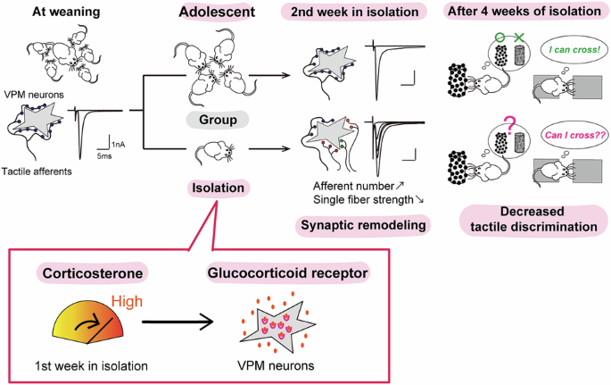 We used social isolation (SI) mice, an experimental model that mimics human social isolation by housing animals individually and restricting social contact. Using this model, we investigated how adolescent SI affects synaptic transmission and connectivity, which relay tactile inputs to whiskers, and how these changes influence the whisker-related behaviors in mice. Tactile inputs to whiskers, a key sensory input in mice, are transmitted from the brainstem maxillary principal trigeminal nucleus (PrV2) to the ventral posterior medial nucleus of the thalamus (VPM), which then sends it to the primary somatosensory cortex (S1)17,18. Early in postnatal development, multiple medial lemniscus fibers (MLFs) containing axons from PrV2 neurons and non-PrV2 neurons form weak excitatory synapses on each VPM neuron19,20,21. By postnatal day 21 (P21), only one PrV2 neuron among the MLFs to each VPM neuron is selectively maintained, while synapses by other MLFs are eliminated19,20,21. Sensory experience with the whiskers during this period is necessary for this refinement, since whisker deprivation at P12-P13 impairs the elimination of MLFs and keeps multiple, redundant MLFs inputs beyond P2119,22. However, little is known about how these refined synaptic connections are maintained after weaning or what factors might destabilize them later in development.
