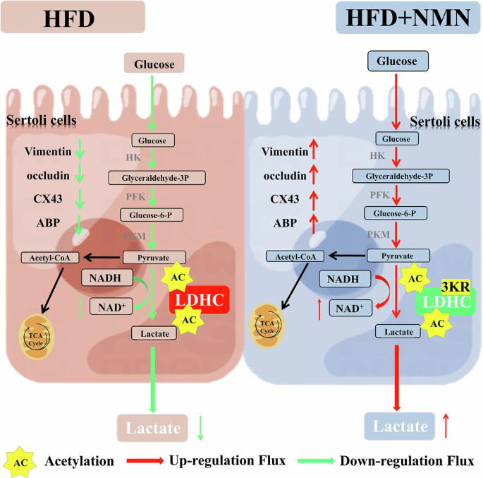 In summary, our findings showed that NMN treatment increases NAD+ levels in the testes of obese mice, which inhibits LDHC acetylation at residues K5, K17, and K90, thereby promoting glycolysis and lactate production and improving obesity-induced impaired spermatogenesis. These findings suggest that LDHC acetylation is a potential therapeutic target for improving spermatogenesis in obese individuals.