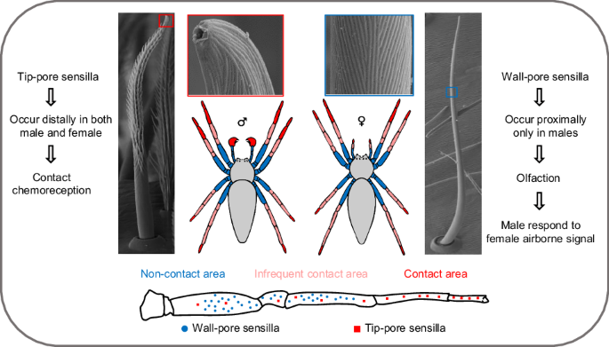 P. mirabilis males possess approximately 3000 wall-pore sensilla on all walking legs, predominantly in the proximal leg segments (Fig. 2B, Supplementary Fig. 1), which are non-contact areas (Fig. 5). This distribution suggests that their ability is to detect airborne signals released by females, similar to A. bruennichi males26. Argiope bruennichi males possess approximately 7000 male-specific wall-pore sensilla, which are likewise concentrated in non-contact areas of their walking legs and are finely tuned to airborne female-produced sex pheromone26. The greater number of wall-pore sensilla in A. bruennichi males may indicate a greater reliance on olfaction for mate search. Male A. bruennichi are attracted from substantial distances to stationary females by signals released from the web10, whereas P. mirabilis males may utilize both olfactory and gustatory information from female dragline silk in their environment.