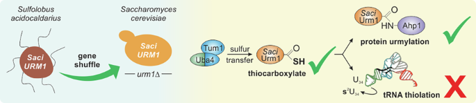 Hence, we studied Urm1 functional conservation using URM1 gene shuffle and complementation between S. acidocaldarius and S. cerevisiae. We show that when expressed in yeast, the archaeal protein is thioactivated by Uba4 and attaches to Ahp1, analogous to S. cerevisiae Urm1. This shows that despite phylogenetic transition between Sulfolobus and Saccharomyces, Urm1-like conjugation has remained largely unchanged over time. Thus, the archaeal modifier qualifies as a candidate stepping-stone for studying the roots of eukaryotic members of the Ubl protein family.