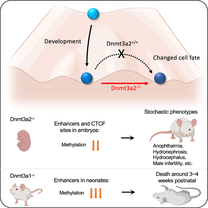 The sporadic phenotypes observed in Dnmt3a2−/− mice, including anophthalmia, hydrocephalus, and hydronephrosis, which reflect profound developmental defects, such as the complete absence of the ureter (hydronephrosis), eye (anophthalmia), and potentially ciliary dysfunction (hydrocephalus), can be attributed to DNA methylation changes caused by the loss of Dnmt3a2 during critical developmental windows, rather than genetic mutations or environmental causes. For example, hydronephrosis in inbred C57BL/6 mice has been linked to autosomal recessive mutations in Aqp2cph, which induce nephrogenic diabetes insipidus and polyuria, leading to obstructive nephropathy without structural deficits in the pyeloureteral peristaltic machinery39,40,41. In such models, hydronephrosis arises postnatally due to functional urinary tract obstruction rather than developmental absence of the ureter. By contrast, the complete agenesis of the ureter in Dnmt3a2−/− mice implicates a failure in early developmental patterning, likely stemming from disrupted epigenetic regulation during critical morphogenetic windows. In addition, the incidence of hydrocephalus in Dnmt3a2−/− mice was 1% (2 out of 203), a 34-fold increase compared to the background level of 0.029% in the inbred C57BL/6 J strain (https://www.jax.org/news-and-insights/2003/july/hydrocephalus-in-laboratory-mice), strongly implicating Dnmt3a2 loss as a contributing factor. Similarly, the observed eye abnormalities, which may result from defects in lens development, and the severe hydronephrosis phenotype, which cannot be explained by genetic mutations alone, further support the role of epigenetic dysregulation in these defects. The fact that environmental factors like alcohol and other teratogens can exacerbate the rate of developmental defects suggests that epigenetic mechanisms, in addition to genetic factors, play a critical role in shaping developmental outcomes. Future studies mapping methylation dynamics at single-cell resolution in Dnmt3a2−/− embryonic tissues could directly test whether stochastic or uniform hypomethylation at lineage-specific enhancers underlies these phenotypes.