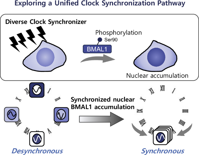 Nuclear entry of BMAL1 and BMAL1-dependent CLOCK, forming the BMAL1:CLOCK heterodimer, is crucial for the transactivation of Per1/2 clock genes. An acute surge in Per1/2 expression is recognized as a hallmark event following clock synchronization10,11. Therefore, we hypothesized that the immediate nuclear accumulation of BMAL1 and CLOCK comprise a pivotal switch for clock synchronization. This study provides a detailed analysis of the mechanism underlying immediate BMAL1 nuclear accumulation during clock synchronization is response to various external stimuli including glucocorticoids, mitogens, 2nd messengers, Ca2+ ionophores, and heat shock stress, in mouse fibroblast cells.