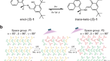 Absorption spectra of an enol-(S)-1 crystal were measured using a transmittance method41. A thin plate-like crystal prepared by solvent evaporation was fixed on a Cu plate with a pinhole of diameter of ~0.5 mm. Transmitted light intensity through the sample was measured over the range of 250–680 nm at 2-nm resolution. Transmitted light intensity through the Cu plate without a sample was also measured in the same wavelength range for blanks. UV–Vis absorption spectra were calculated according to the Beer–Lambert–Bouguer law, and then divided by the crystal thickness to obtain the absorption coefficient for standardization. Sample temperature was regulated by a Peltier thermostat. A diffuse reflectance spectrometer (Lambda 650, Perkin Elmer) was also employed to measure the spectral behavior upon visible light irradiation (λ = 488 nm, FOLS-2, Sawaki Kobo).