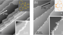 Self-organization of molecular clusters, also fundamental in the fields of molecular electronics and sensing technology, has attracted a lot of attention9,10,11. In this context, the role of surface defects can be very contradictory. For example, on the one hand, surface steps acting as grain boundaries12 can prevent long-range order across different substrate terraces. On the other hand, steps have shown potential to be used as selective adsorption sites13 as well as to induce rotational alignment of molecules14,15. And, applying multi-step preparation techniques, e.g. thermally induced polymerization causing an alignment of the step edges, the prepared step edges can be used to steer molecular layer growth16,17. To find suitable combinations of surfaces and molecules, one has (a) to establish appropriate preparation methods, (b) to prove chemical stability of the molecule on the surface as well as (c) to understand the interaction of the molecules with the surface and its defects in order to finally control the growth of 1D (molecular wires), 2D (monolayers) and 3D molecular structures15,18.