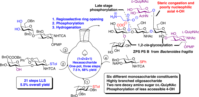 In comparison, no synthetic studies have been reported for PS B and PS A2 (Fig. 1). PS B isolated from B. fragilis of NCTC 934331 is a novel phosphorylated O-polysaccharide comprising of rare deoxy amino sugars viz. 2-acetamido-2,6-dideoxy-D-glucopyronanose (D-QuipNAc) and 2-acetamido-2,6-dideoxy-L-glucopyronanose (L-QuipNAc). In addition to this, PS B also contains 2-aminoethyl phosphonate moiety (AEP) which is believed to play a crucial role in its potent bioactivity as well as stability against enzymatic degradation32. The structure of hexasaccharide repeating unit of the O-polysaccharide was established as →3)-β-D-QuipNAc-(1→4)-[α-L-Fucp-(1→2)-β-D-GalpA(1→3)[[2-AEP-4]]-β-D-GlcpNAc-(1→3)]-α-D-Galp-(1→4)-α-L-QuipNAc-(1→. It should be noted that the positive charge on amino group of 2-AEP and the negative charge on phosphonate or carboxylate group imparts the zwitterionic character. Currently, there are no licensed vaccines available against B. fragilis, although there are many studies in this direction which have evaluated a range of antigens including outer-membrane proteins, O-polysaccharides, and exopolysaccharides. The rare sugars (both L and D) containing hexasaccharide RU is an attractive synthetic target for vaccine development. Over past decade, our laboratory has developed efficient and highly regioselective protocols for the synthesis of orthogonally protected rare deoxy amino sugar building blocks via one-pot SN2 displacements of D and L-hexopyranosidic 2,4-bis-triflates which enabled us to assemble a varity of complex bacterial glycans including the RU of PS A129,33,34,35,36,37. Herein, we report the first total synthesis of the structurally complex phosphorylated branched hexasaccharide RU of PS B via an efficient and stereoselective one-pot assembly.