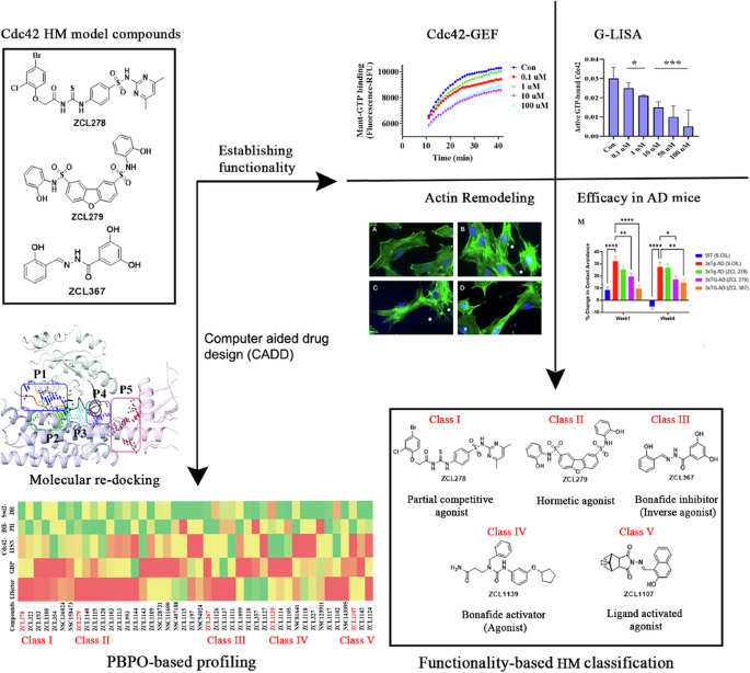 This dual enabling classification approach could have significant implications, especially for targeting devastating chronic human diseases such as cancer and brain disorders. For AD and ADRD, they likely develop as results of dysregulation of multifaceted biological processes. Large omics data are now available that demonstrate many gene dysregulations are spatially affected and cell/tissue selective. In AD mouse models, we showed that small Rho GTPase signaling is even dysregulated at both spatial and planar levels in brain23. Therefore, homeostatic targeting may have profound benefits in addition to the traditional and simple inhibitory or stimulatory treatment regimens. In this regard, it is exciting that our HM model compounds ameliorated AD-like social behavior in a mouse model. Figure 5A–J showed that the five classes of Cdc42 modulators cover a wide range of effects on GTP loading depending on whether GEF activation is concurrently present or not. It is possible that in the diseased tissues, some HMs may have the capability to stimulate where Cdc42 is over-suppressed or reduce where Cdc42 is over activated. These HMs can thus target diseased cells or tissues while protecting tissues that are unaffected.
