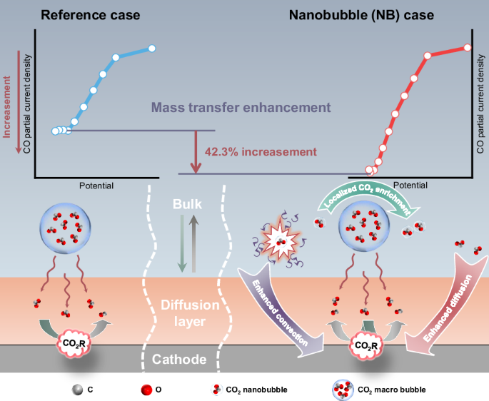 One emerging solution is using nanobubbles, i.e., gas bubbles with diameters typically in the tens to hundreds of nanometers23,24,25. Nanobubbles possess unique properties, i.e., localized CO2 enrichment, enhanced gas-to-solution transfer, and micro-convection, making them well-suited to mitigating diffusion limitations in aqueous CO2RR systems. The mass transfer enhancement mechanisms are illustrated in Fig. 1: i) Localized CO2 Enrichment: Nanobubbles act as stable, localized CO2 reservoirs, providing a continuous supply of CO2 near the catalyst surface and hence leading to an increased effective solubility of CO2. ii) Enhanced gas-to-solution transfer: The large surface-area-to-volume ratio of nanobubbles facilitates faster CO2 exchange between the gas phase and the electrolyte, improving diffusion and reducing the formation of depletion zones during CO2RR. iii) Micro-Convection: Nanobubbles can induce localized mixing, enhancing CO2 transport to the catalyst and improving overall mass transfer, especially in diffusion-limited regimes26,27,28. Previous studies on nanobubbles in water treatment, flotation, and catalysis have demonstrated their potential to improve mass transfer and reaction efficiency29,30,31. In electrochemical systems, nanobubbles have shown the ability to enhance gas-phase transport by providing sustained CO2 availability and improving reaction kinetics, making them an attractive solution for overcoming the inherent mass transfer limitations in aqueous CO2RR32,33. However, research into their application in aqueous CO2RR remains limited, particularly in understanding their role in addressing mass transfer limitations under high-performance conditions. Additionally, the interaction between nanobubbles and different catalysts or electrolytes remains underexplored, raising questions about the universality of their benefits.