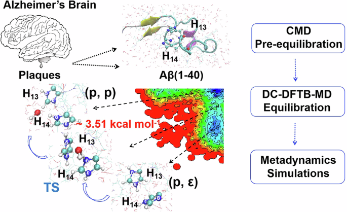 To unravel the pathogenesis of Alzheimer’s disease and advance therapeutic approaches, Our group employed molecular dynamics simulations to investigate the effects of histidine tautomerism on Aβ-40 monomers, homodimers, and pentamers25,26,27,28,29. In one of our earlier studies, we explored the synergistic influence of histidine tautomerism and its interactions with Au(111) surfaces, using a combination of molecular dynamics simulations and two-dimensional infrared spectroscopy30. This integrative approach provided valuable insights into how intrinsic tautomeric switching, together with external environmental factors such as metallic surfaces, can modulate amyloid misfolding pathways relevant to Alzheimer’s disease. Additionally, quantum mechanical calculations were employed to investigate the role of 3–5 water molecules in facilitating proton transfer during histidine tautomerization, although these studies were limited to the amino acid level, specifically focusing on the δ and ε tautomers31. A more comprehensive understanding of the tautomer hypothesis requires a deeper investigation into proton transfer dynamics within peptides and water molecules. Understanding the proton transfer mechanism of histidine tautomers in Aβ-40 protein is important for elucidating the origin of Aβ aggregation. Several studies have emphasized the critical role of the tautomeric states of histidine residues 6, 13, and 14 in Aβ-40 in influencing amyloid-peptide aggregation26,27,28,32. However, the mechanism of the proton transfer in histidine tautomers within the tautomerism hypothesis has been inadequately explored, primarily due to the technical constraints in clinical diagnostics and the difficulty of theoretical studies. Moreover, the modeling systems containing excess protons and solvated protein are not feasible to simulate at the DFT level due to their large number of atoms.