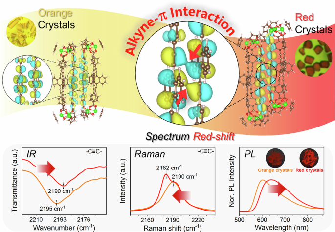 It is worth noting that the effect of alkyne-π interactions on light absorption/emission can be extended to other phases beyond Red-1. Particularly, by controlling the synthetic temperature at 0 °C, a new phase (Red-2) is successfully obtained (Supplementary Fig. 17a). Meanwhile, by dissolving Red-1 in methanol followed by evaporation, we obtain another new compound with orange color (Orange-2) (Supplementary Fig. 17b, c). The detailed analyses of the intermolecular interactions in Red-2 and Orange-2 are shown in the Supplementary Discussions and Supplementary Figs. 18 and 19. Interestingly, alkyne-π stacking interactions are also observed in Red-2 but not in Orange-2. These observations further corroborate the significant influence of the alkyne-π interactions on light absorption and emission.