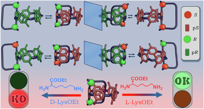 Definitive evidence on the enantioselective binding abilities of HOMO-2a was obtained by titrating in-pS-M-(R,R)-2a with L- and D-LysOEt esters (Fig. 10c and Supplementary Fig. S27). In this case, the positively-signed band at 309 nm underwent a complete inversion upon addition of each guest. Data fitting56,57 showed that in-pS-M-(R,R)-2a preferentially recognizes L-LysOEt (KL = 6.78 ± 0.06 × 103 M–1) over D-LysOEt (KD = 1.94 ± 0.03 × 103 M–1), yielding an enantioselectivity ratio (KL/KD) of 3.5 (Fig. 10b)62. Remarkably, the preference of out-pR-M-(R,R)-2a for L-LysOEt aligns perfectly with previously reported data on chiral induction in free-rotating pillar[5]arenes, where the formation of L/pR and D/pS pairs is favored35,60.
