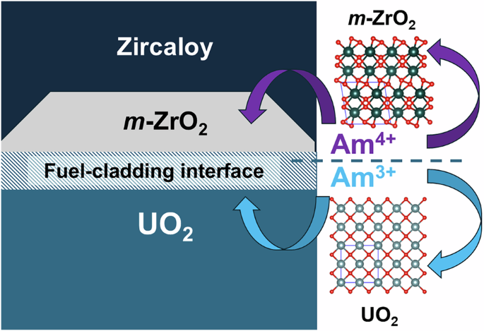 From the results of the present investigation, it is pertinent to consider the reactivity and co-occurrence of m-ZrO2 and Am in UO2 based nuclear fuel. The in-operando formation of ZrO2 along the cladding inner surface of Zircaloy is attributed to the increase in the fuel’s oxygen potential that arises with increasing fuel burnup (fuel fission). Chemically, this effect originates from the accumulation of fission products, particularly those with lower valence than uranium (tetravalent). Lanthanides and minor actinides, which predominantly occur in the trivalent state, contribute strongly to this process. It is most pronounced at the rim of fuel pellets due to the known “rim effect”, arising from enhanced production and fission of Pu from 238U capture. As a result, oxidised phases can form in close proximity to the Zircaloy-based cladding, favouring the formation of oxidised ZrO2. Studies of SNF have identified that the ZrO2 polymorphs present are primarily m-ZrO2 and t-ZrO27,32. The formation of t-ZrO2 is attributed to stabilisation by pressure, temperature, or significant incorporation of fission products7,32. In contrast, m-ZrO2 initially forms due to changes in the oxygen partial pressure and is therefore considered the first polymorph to form paragenetically within the fuel. Critically, m-ZrO2 tends to contact the UO2 fuel between the Zr cladding, which can promote solid-state reactions and chemical transport between the phases (Fig. 6)32. The present work has demonstrated that m-ZrO2 can retain Am4+ but rejects Am3+, which is soluble in UO228. The redox state of Am at high temperature depends strongly on the oxygen partial pressure. In the present work, conditions of −301 kJ/mol or 4 × 10−9 atm at 1600 °C were used. Previous studies indicate that under these conditions, Am4+ is not stable in binary oxides19. However, the presence of water vapour can enhance oxygen exchange or diffusivity of ions with other phases, provided it results in thermodynamic stabilisation23,24. In the present synthesis, 5 mol% Am was used, of which 20% reports to the m-ZrO2 phase, suggesting that tetravalent Am is stabilised within m-ZrO2. Such results on thermodynamic structure stabilisation have been made for other actinide oxide materals33,34. In relation to UO2-based nuclear fuel, comparable oxygen partial pressures used in the present study are generally only reached at higher burnup35,36. Furthermore, although high temperatures similar to those used in the present synthesis are generally not expected in nuclear fuels beyond accident scenarios, significantly lower temperature reactivity of m-ZrO2 can be expected5. Consequently, interactions between Am and m-ZrO2 can be expected at high burnup. The rejection of Am3+ from m-ZrO2 implies in pile chemical partitioning between the Am4+ and Am3+ redox states with the m-ZrO2 and UO2 phases, respectively. This process is graphically illustrated in Fig. 6. This chemical behaviour could consequently influence both the stability of the fuel cladding and the Am source term during SNF storage.
