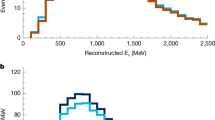 The particle identification capability of our technique builds on the low density of organic scintillator, typically 0.9 g cm−3, and its high fraction of hydrogen with H-to-C ratios typically in the range 2–3. Its low average atomic number favours a long radiation length, around 0.5 m, a minimal photo-electric effect and energy losses by bremsstrahlung that do not start to dominate until e−’s have an energy of around 100 MeV. The extremely low cross-section for the photo-electric effect in scintillator, such as Linear-Alkylbenzene (LAB)17, means that an MeV-scale γ is highly unlikely to interact that way. On the rare occasion that this does happen an e− of the same energy is produced, which sets a limit to the level at which e−’s and γ’s can be distinguished. In scintillators, the fraction of 2 MeV γ’s that interact via the photo-electric effect (the photofraction) is only 6 × 10−6 whereas in a heavy liquid such as xenon it is 2.9%. Doping a scintillator with a metal causes the photofraction to increase. For example, if indium at 10% by mass is used the photofraction rises to 0.17%. These numbers are illustrated in Fig. 2d, allowing comparison of the probability of the event reconstruction misidentifying a γ as an e− with the floor to performance set by the detector material.