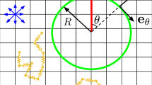 Figure 10 displays the energy spectrum for (β, λ) = (−5, 4) and the two packing fractions ϕ = 0.6, 0.68, and various system sizes. The simulations show two power-law regimes for a given density, namely \(E(k) \sim {k}^{\hat{\kappa }}\) for k < km and E(k) ~ k−κ for km < k < kc, with km corresponding to the position of the maximum of E(k). Such a maximum in E(k) is a feature of microswimmer active turbulence, and reflects a characteristic vortex size13,35,36. Our simulations yield approximate vortex sizes of 5 (10bz) and 10 squirmer lengths (20bz) for ϕ = 0.6 and 0.68, respectively. They are roughly consistent with the patterns of Fig. 8, the crossover from ballistic to diffusive motion in the mean-square displacement of Fig. 6, and the minimum of the correlation function of Fig. 9(b). Vortex sizes on the order of 5–10 microswimmer lengths are also found in experiments13,35,38.