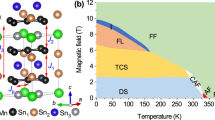 For electrical transport measurements samples were polished to dimensions of ~1.00 × 0.40 × 0.15 mm with the long axis corresponding to either the c-axis, or the in-plane, [1, 1, 0], direction. An excitation current of 4 mA was used in all measurements presented. Identical data were also measured with a 2 mA excitation, however, the higher 4 mA current produced less noise without impacting the features observed. Electrical contacts were affixed using Epotek H20E silver epoxy and 25 μm Pt wires with typical contacts resistances of ≈ 20 Ω, such that current was directed along the c-axis or in the ab-plane. MR and Hall effect data were collected using the resistivity option and rotator within a Quantum Design DynaCool PPMS equipped with a 9 T magnet. MR is defined as MR = (ρ(H) − ρ(0))/ρ(0), where ρ(H) and ρ(0) are the longitudinal resistivity with and without an applied magnetic field, H. The Hall resistivity was asymetrized from the positive and negative applied magnetic fields via ρxz = [ρT(+H) − ρT(−H)]/2, where ρT is the resistivity measured via the transverse voltage contacts in the Hall bar geometry. Hall conductivity for current along the c-axis was calculated via the relation \({\sigma }_{zx}={\rho }_{xz}/({\rho }_{xz}^{2}+{\rho }_{zz}{\rho }_{xx})\). Here, ρzz is the longitudinal resistivity for current along the c-axis and magnetic field in the ab-plane, ρxx is the longitudinal resistivity for mutually perpendicular current and magnetic field in the ab-plane, and ρxz is the Hall resistivity for current along c. It is to be noted that the ρzzρxx term in the denominator is due to the anisotropy in ρxx and ρzz in the hexagonal system as evident in Supplementary Fig. 4. The fits of the Hall conductivity were piecewise above and below H2, where the transverse conical spiral to fan-like transition imparts a significant change to the electronic structure and hence the Hall conductivity. DC magnetization measurements were performed in the same PPMS system using the ACMS II option.