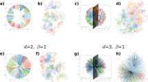 where \(\zeta =\sqrt{-K}\) parametrises the curvature K < 0 of the hyperbolic space (where usually ζ = 1 is used), T ≥ 0 is a model parameter called temperature, and Ri is the cutoff distance of the connection probability at the arrival of node i. The latter is adjusted in such a way that the expected number of links formed between the new node i and the rest of the system is equal to m≥1 that acts as an additional model parameter related to the average degree of the network \(\bar{k}\) where \(\bar{k}\approx 2m\). Note that due to the decaying nature of p(xij) in Eq. (1), nodes that are closer to each other in the hyperbolic sense are more likely to become connected than the ones found at large distances. This tendency that newly-appearing nodes favour hyperbolically closer nodes to connect can be regarded as an optimisation of a trade-off between the popularity (reflected by the radial coordinate) of a possible candidate to connect and its similarity (the angular distance) compared to the newly arriving node15. Owing to the hyperbolic nature of the underlying geometry, the radial coordinate of the nodes has a very strong effect on the degree, with the most inner nodes usually becoming hubs in the long run. In order to allow control over the degree distribution, an outward shift of the nodes is also introduced as