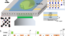 The NV centers adopted here were generated by implanting 16 keV \({{\!}^{14}{{{{{\rm{N}}}}}}}_{2}^{+}\) ions with a dose of 1 × 1013 cm−2 into a [100]-faced ultra-pure single crystal diamond (Element six) followed by annealing at 1000 °C for 4 h. The Fe3GeTe2 single crystals were grown by the chemical vapor transport (CVT) method. High-purity Fe (99.95%), Ge (99.999%), and Te (99.999%) powders were mixed together in a stoichiometric molar ratio of 3:1:2. The temperatures of the source and growth zones were raised to 750 and 700 °C at a rate of 5 °C per min, respectively, and the temperatures were maintained for 7 days. Shiny black plate-like crystals were obtained after the furnace cooled naturally to room temperature. The diamond was placed in piranha solution (H2SO4:30%H2O2 = 7:3) and cooked at 120 °C for 2 h to remove surface impurities. A 25 μm diameter gold wire was soldered to the substrate glued with diamond to supply microwaves. The hBN flakes of 200–500 nm were mechanically exfoliated onto the diamond (following the optimum distance in ref. 29) and within 100 μm of the gold wire. Fe3GeTe2 crystals were exfoliated onto polydimethylsiloxane (PDMS, Gel-Pak, WF-60-X4) for post-transfer in an inert gas glovebox with water and oxygen concentrations less than 1 ppm. The Fe3GeTe2 multilayer was identified by optical contrast and was transferred onto the diamond with encapsulation of hBN at both sides.