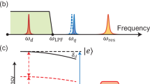 Figure 5a shows the AC Stark shift arising from the off-resonant nature of the subharmonic drive. For a maximum pulse amplitude of 1 V, the measured shift is ~−33 MHz for the λ/4 filter and −73 MHz for the λ/2 filter. We obtain a good agreement between the measured Stark shift and the fit using a quadratic function in the pulse amplitude as theoretically expected from Eq. (5) in the “Method” section.