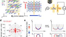 in which \({{{{\mathcal{E}}}}}_{x}\) and \({J}_{y}^{2\omega }\) can be obtained from the excitation current \({I}_{x}^{\omega }\) and measured perpendicular \({V}_{y}^{2\omega }\) via Ohm’s law as \({{{{\mathcal{E}}}}}_{x}=\frac{{I}_{x}^{\omega }}{\sigma W}\) and \({J}_{y}^{2\omega }=\frac{\sigma {V}_{y}^{2\omega }}{W}\). As shown in Fig. 6a, W is the effective sample width, and the longitudinal conductance is of the order of σ ~ 10−5 S8. From the Drude formula \(\sigma =\frac{{n}_{0}{e}^{2}\tau }{\tilde{m}}\), one can also estimate the relaxation time τ to be ~ 10−14 s with the effective mass being \(\tilde{m}=0.3{m}_{e}\), me the electron mass8, and n0 the charge density. Tuning this charge density n0 also modifies the Fermi energy EF, as demonstrated by first-principle calculations in a related system8.