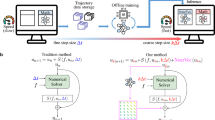 When training a neural operator \(\hat{{{{\mathcal{G}}}}}\), a widely adopted approach is to construct a dataset of N discrete data pairs \(({{{{\boldsymbol{u}}}}}_{i,j},{{{{\boldsymbol{v}}}}}_{i,{j}^{{\prime} }})\), i = 1, …, N, which correspond to ui and vi evaluated at spatial locations j = 1, …, K and \({j}^{{\prime} }=1,\ldots ,{K}^{{\prime} }\), respectively. Note that K and \({K}^{{\prime} }\) can, but need not be equal, and can vary for different i, which we omit for notational simplicity. In neural operator learning, the goal is to learn an approximation of the ground truth operator \({{{\mathcal{G}}}}\), that maps an input function ui to an output function vi via a neural operator \(\hat{{{{\mathcal{G}}}}}\). The functions are given via K and \({K}^{{\prime} }\) discretized input and output points, respectively. On this dataset, \(\hat{{{{\mathcal{G}}}}}\) is trained to map ui,j to \({{{{\boldsymbol{v}}}}}_{i,{j}^{{\prime} }}\) via supervised learning, where \(\hat{{{{\mathcal{G}}}}}\) is composed of three maps43,44: \(\hat{{{{\mathcal{G}}}}}:= {{{\mathcal{D}}}}\circ {{{\mathcal{A}}}}\circ \,{{{\mathcal{E}}}}\), comprising the encoder \({{{\mathcal{E}}}}\), the approximator \({{{\mathcal{A}}}}\), and the decoder \({{{\mathcal{D}}}}\). First, the encoder \({{{\mathcal{E}}}}\) transforms the discrete function samples ui,j to a latent representation of the input function. Then, the approximator \({{{\mathcal{A}}}}\) maps the latent representation to a representation of the output function. Lastly, the decoder evaluates the output function at spatial locations \({j}^{{\prime} }\). The neural network \(\hat{{{{\mathcal{G}}}}}\) is then trained via gradient descent, using the gradient of, e.g., a mean squared error loss in the discretized space \({{{{\mathcal{L}}}}}_{i}=\frac{1}{{K}^{{\prime} }}{\sum }_{{j}^{{\prime} }}\parallel {\hat{{{{\boldsymbol{v}}}}}}_{i,{j}^{{\prime} }}-{{{{\boldsymbol{v}}}}}_{i,{j}^{{\prime} }}{\parallel }_{2}^{2}\), where ∥2 is the Euclidean norm.
