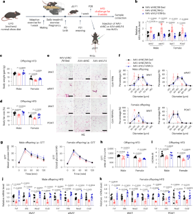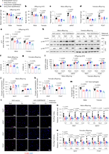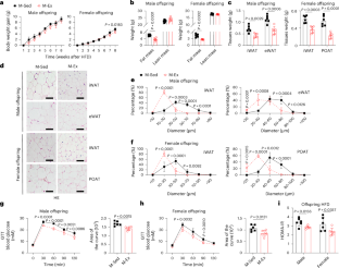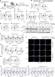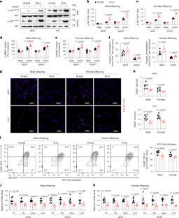 Mice were treated as indicated in Fig. 5. a,b, Glucose concentration during an i.p. GTT in male (a) and female (b) offspring after 7 weeks of HFD feeding. c, HE staining of iWAT and VAT from male and female offspring, respectively, Scale bar: 50 μm. d,e, Quantitative analyses of adipocyte size distribution of iWAT and VAT from male (d) and female (e) offspring. f,g, Quantitative analysis of p-AKT/AKT ratio in Fig. 5h, with (f) for male offspring and (g) for female offspring. n = 3 mice for each group. h,i, Quantitative analyses of the IF staining of F4/80 in Fig. 5l. j, Flow cytometry for detecting CD11b+/F4/80+ macrophages from CD45+ cells in SVF isolated from offspring iWAT. For statistical analyses, two-way ANOVA with Bonferroni’s post hoc tests were performed in f-i. All values are represented as means with error bars representing S.D. n = 6 for each group unless otherwise mentioned. i.p., intraperitoneal injection; GTT, glucose tolerance test; SVF, stromal vascular fraction; IF, immunofluorescence.