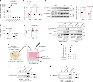 a, Heatmap of differentially expressed serum protein between Ex and Sed pregnant dams, as assessed by LC-MS/MS (n = 3 mice/group) (P < 0.05). b, Differentially expressed proteins identified by the intersection of secreted proteins and inflammation-related proteins based on serum proteomics results (P < 0.05). c, RT-qPCR analysis of Serpina3c mRNA expression in the placentas of dams. d, Mice were treated as described in Fig. 3f. RT-qPCR analysis of Serpina3c mRNA expression in iWAT, liver and Gas of dams was shown. e, Pregnant dams were injected with GFP or Flag-Serpina3c adenoviruses (Ad) in iWAT at embryonic day 2.5 (E2.5), which is equal to gestation day 18.5 (d18.5) for mother. At E18.5 (equal to gestation d18.5 for mother), maternal iWAT and fetal liver and inguinal region were collected. Flag antibody-mediated IP followed by western blotting with Serpina3c antibody was performed, n = 3 mice for each group. f, Immunofluorescence (IF) staining of CK7 protein in primary mouse trophoblast cells, with MAEC cells as a negative control. CK7 serves as the marker for trophoblast cells. scale bar: 50 μm, n = 3 mice for each group. g, Flag antibody-mediated IP in primary trophoblast cells extracted from dams injected locally in iWAT with Ad-GFP or Ad-Flag-Serpina3c, followed by western blotting with a Serpina3c antibody, n = 3 mice for each group. h, CM from Ad-GFP or Ad-Flag-Sfrp5-infected adipocytes was added to the apical chamber (AC) of transwell inserts cultured with BeWo cells. IP was performed using the Flag antibody, followed by western blotting with Sfrp5 antibody to detect the presence of Flag-Sfrp5 in the supernatant of apical and basolateral chambers, n = 3 independent biological replicates. For statistical analyses, unpaired two-tailed Student’s t tests between Sed and Ex groups were performed in c, d. All values are represented as means with error bars representing S.D. n = 6 for each group unless otherwise mentioned. iWAT, inguinal white adipose tissue; Gas, gastrocnemius; IP, immunoprecipitation; CM, culture medium.