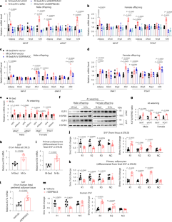 a-e, Mice were treated as indicated in Fig. 1. Offspring mice were sacrificed for analysis after weaning. a, Body weight of male and female offspring mice at weaning. b, Body composition of male and female offspring mice at weaning. c,d, mRNA levels of the indicated genes were determined by RT-qPCR in iWAT and VAT from male (c) and female (d) offspring mice at weaning. e, SVF isolated from embryonic day18.5 (E18.5) fetuses were induced to adipogenic differentiation into mature adipocytes. Light microscope images of the cells at Day 0 (D0), Day 2 (D2), and Day 4 (D4) of differentiation and Oil Red O staining images at Day 6 (D6) of differentiation were shown. Scale bar: 50 μm, n = 3 mice for each group. f, Diagram showing three regions in the mouse (mus) Klf4 gene promoter and two regions in human (homo) KLF4 gene promoter. g, Klf4 mRNA levels were determined by RT-qPCR in 3T3-L1 preadipocytes, C2C12 myotubes, and primary hepatocytes treated with 20 ng/ml rSerpina3c for 24 h. h-j, 5mc and 5hmc enrichment on mouse Klf4 gene promoter in 3T3-L1 preadipocytes (h), C2C12 myotubes (i), and mice primary hepatocytes (j) treated with 20 ng/ml rSerpina3c for 24 h. NC, nonspecific control. k, KLF4 mRNA levels were determined by RT-qPCR in human primary adipocytes treated with 20 ng/ml rSERPINA3 for 24 h. l, 5mc and 5hmc enrichment on human Klf4 gene promoter in human primary adipocytes treated with 20 ng/ml rSERPINA3 for 24 h. For statistical analyses in a-d, g-l, unpaired two-tailed Student’s t tests were performed. All values are represented as means with error bars representing S.D. n = 6 for each group. rSerpina3c, recombinant Serpina3c protein; rSERPINA3, recombinant SERPINA3.